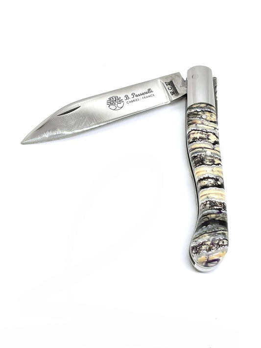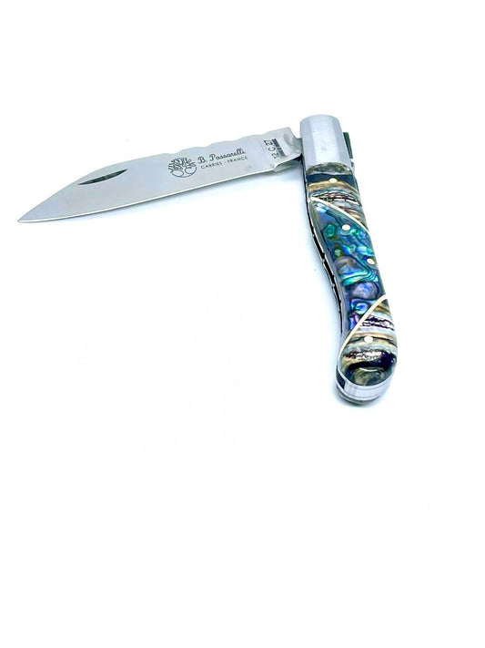 Coutellerie Passarelli - Couteau Aurillac lame pliable 10.5 cm défense et molaire de mammouth, abalone lame pliable 10.5cm