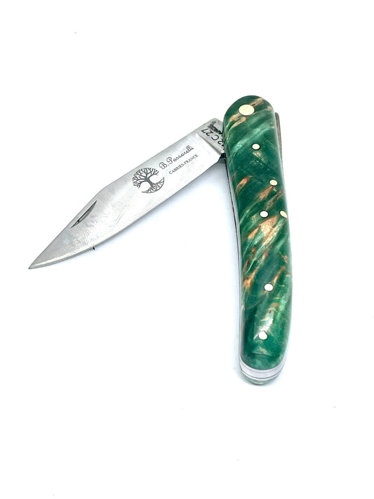 Coutellerie Passarelli - Couteau Alsacien lame pliable 10 cm Bouleau madré teinté et stabilisé vert