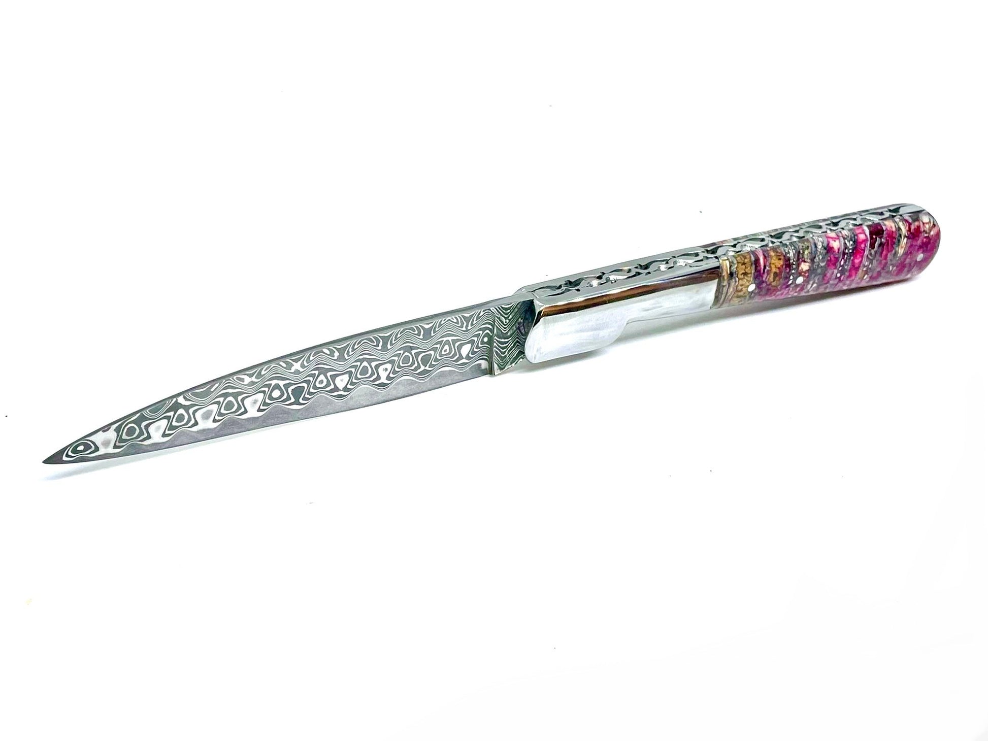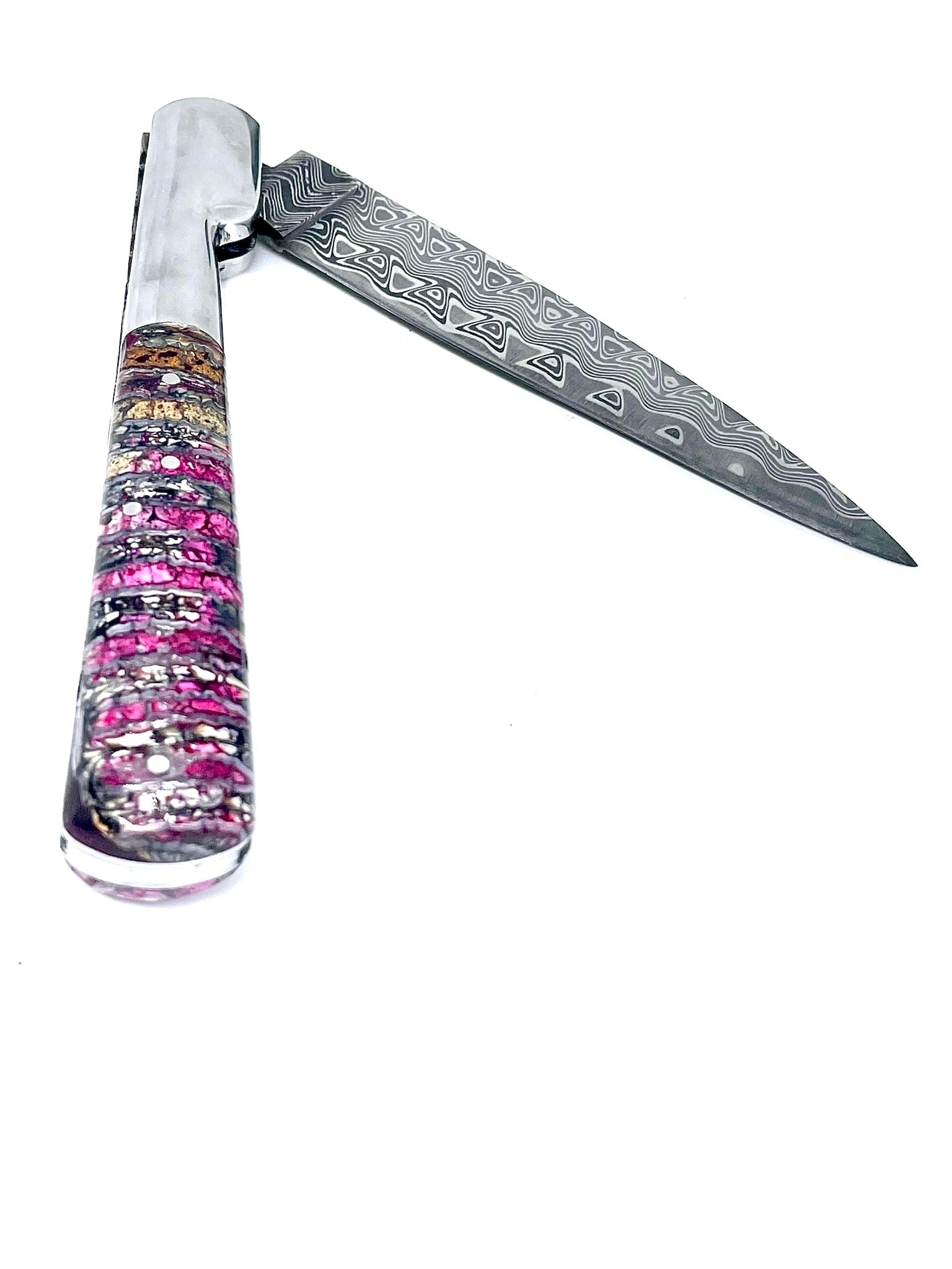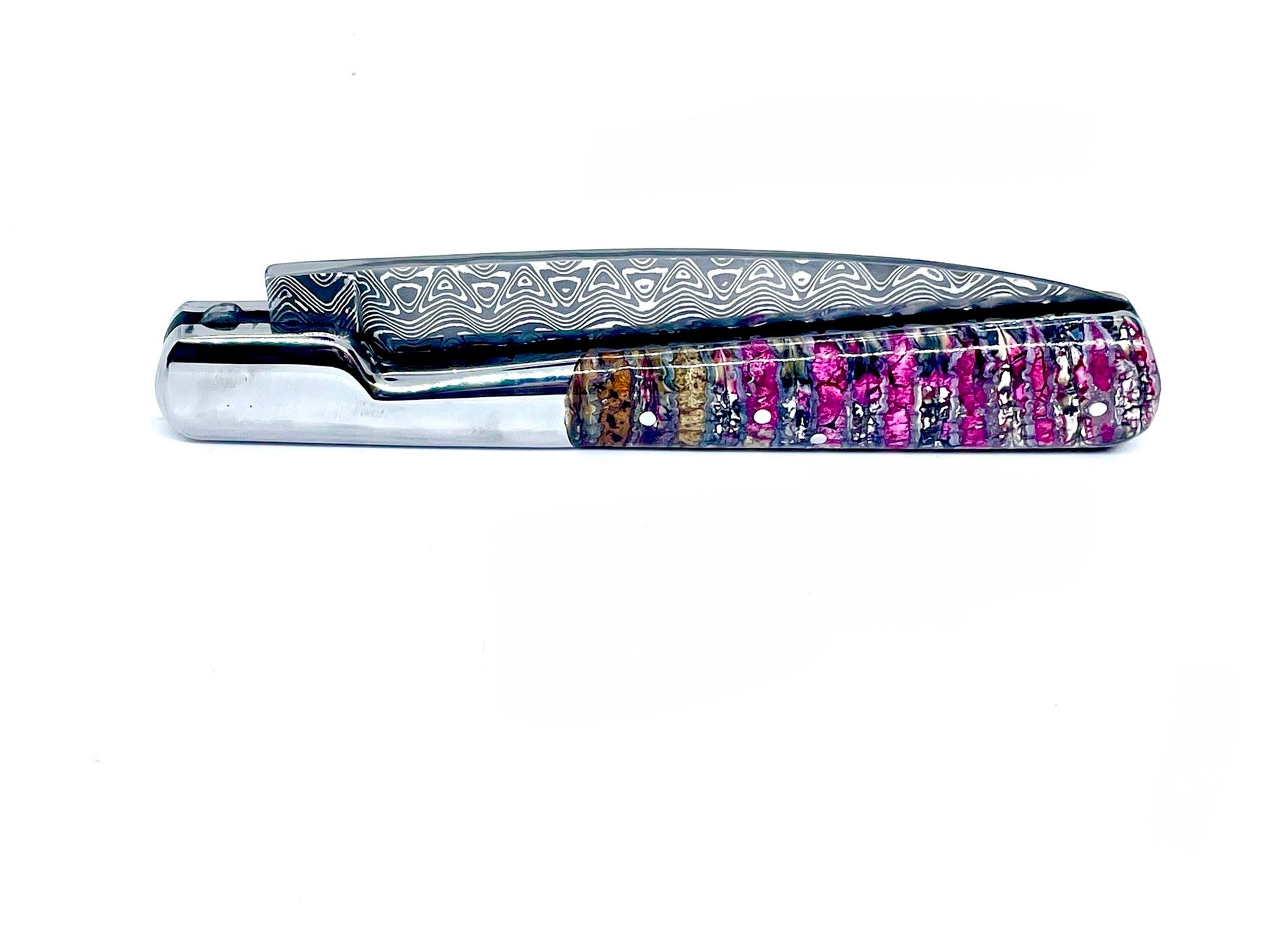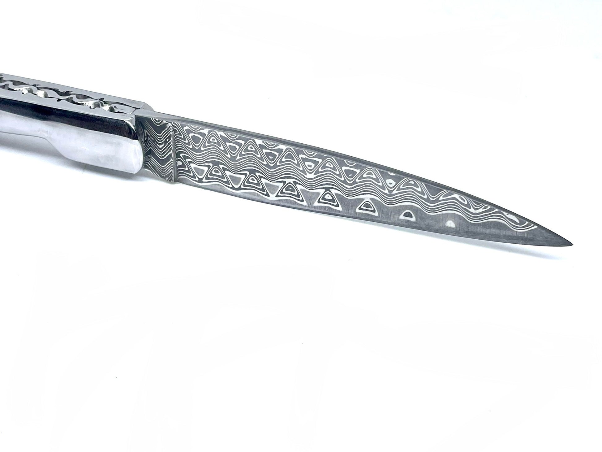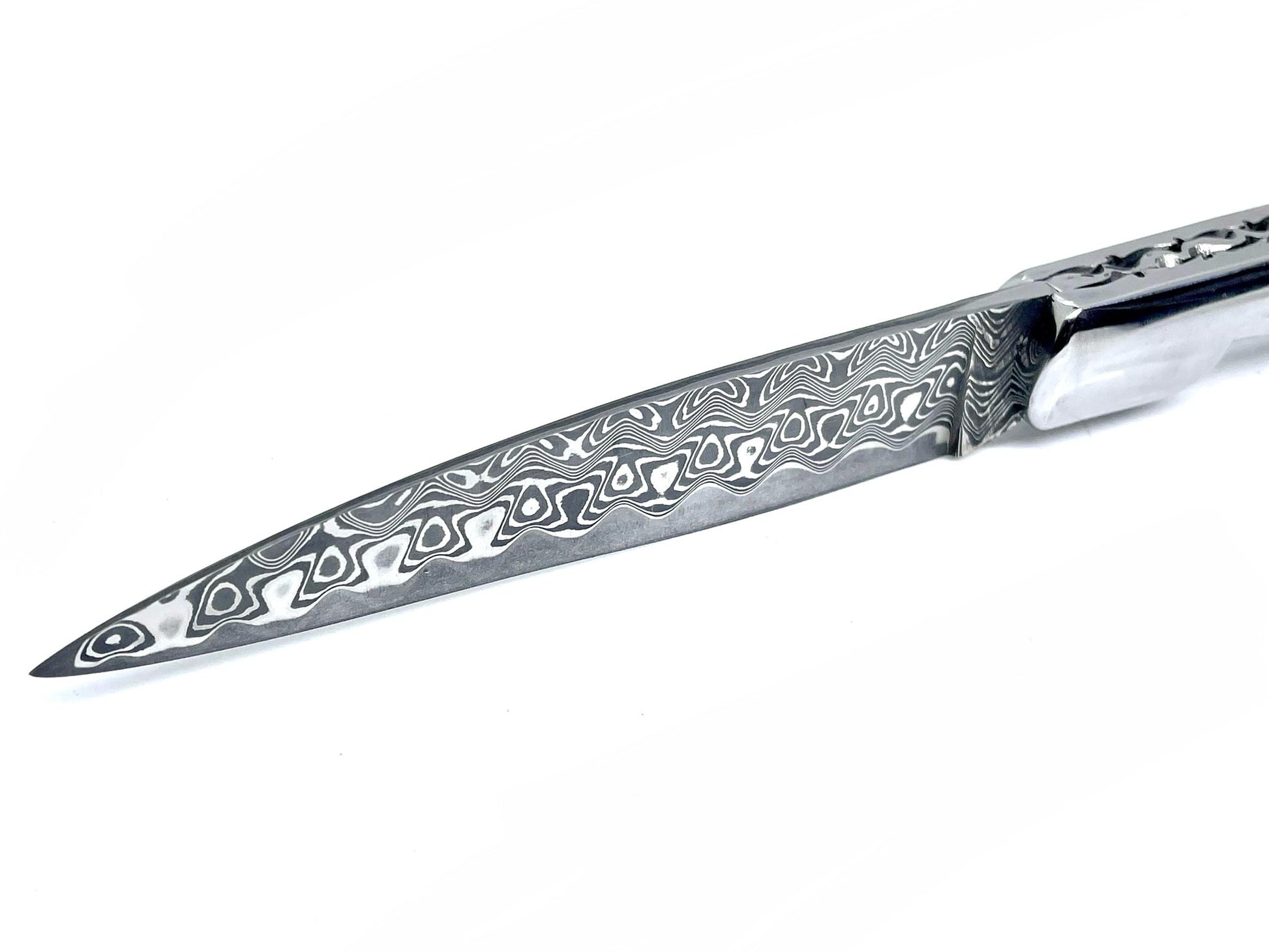 Lame de Damas inox torsadée de 160 couches, très haute qualité provenance des Forges de Thiers, capitale mondiale de la coutellerie.