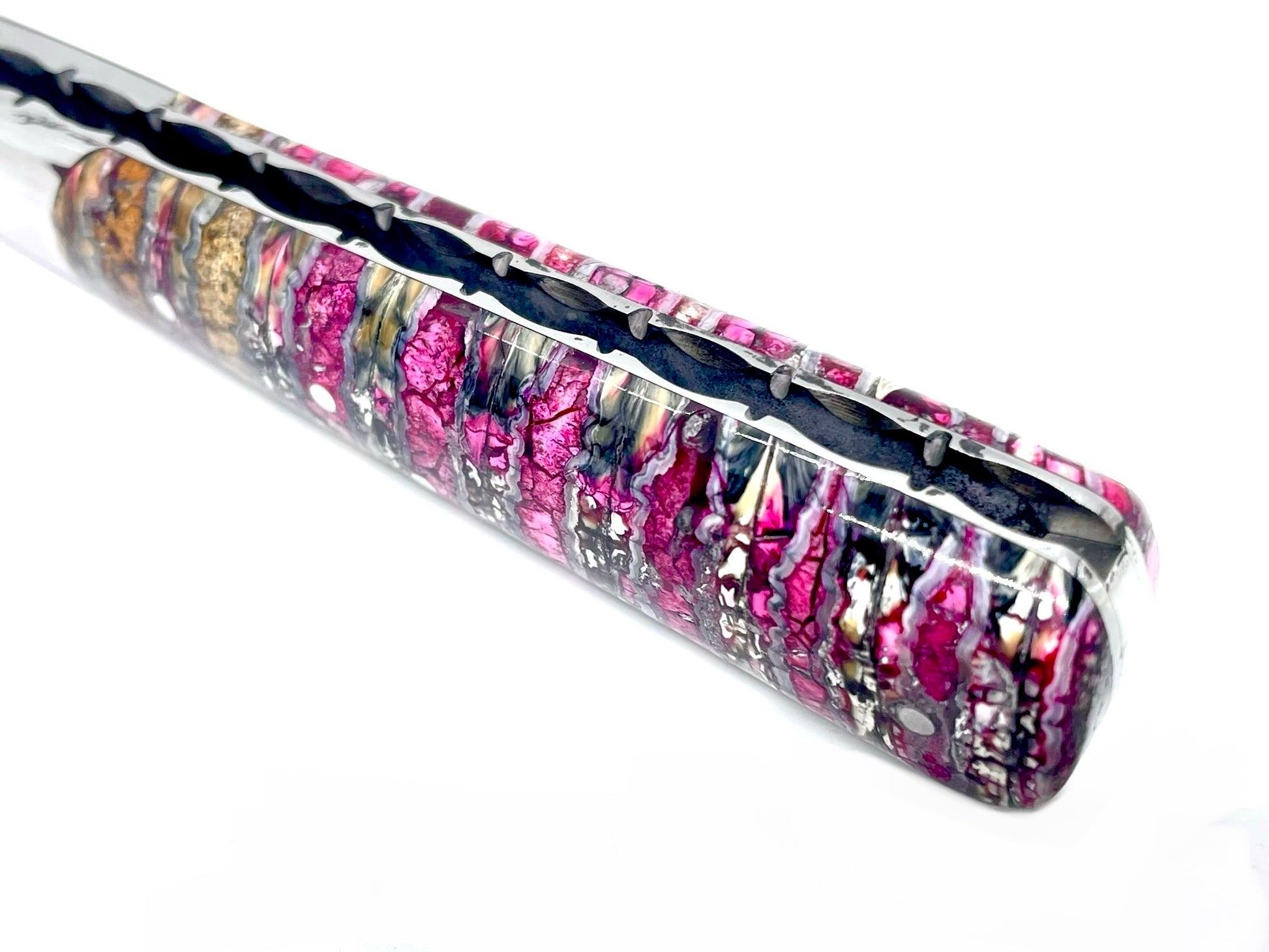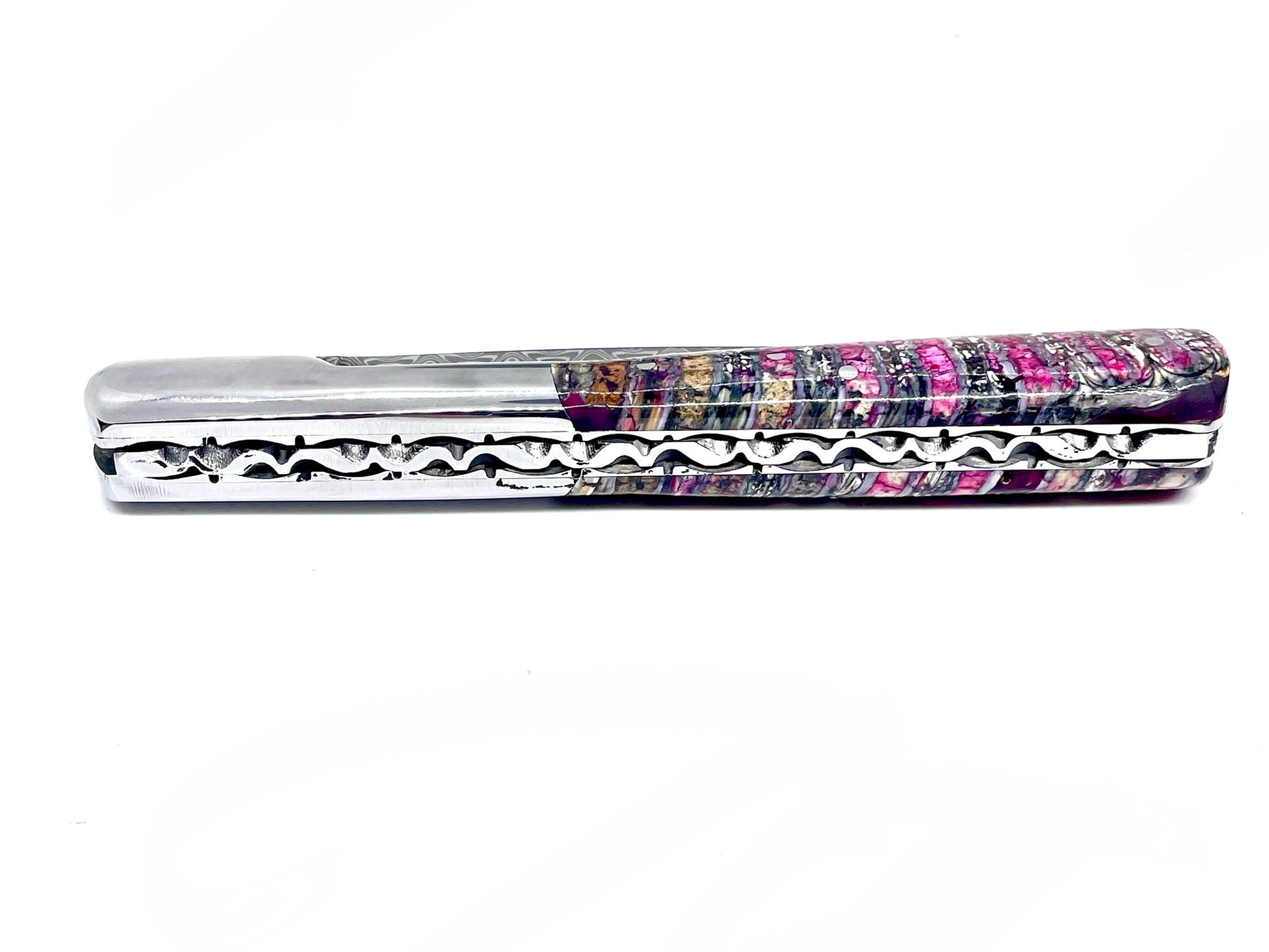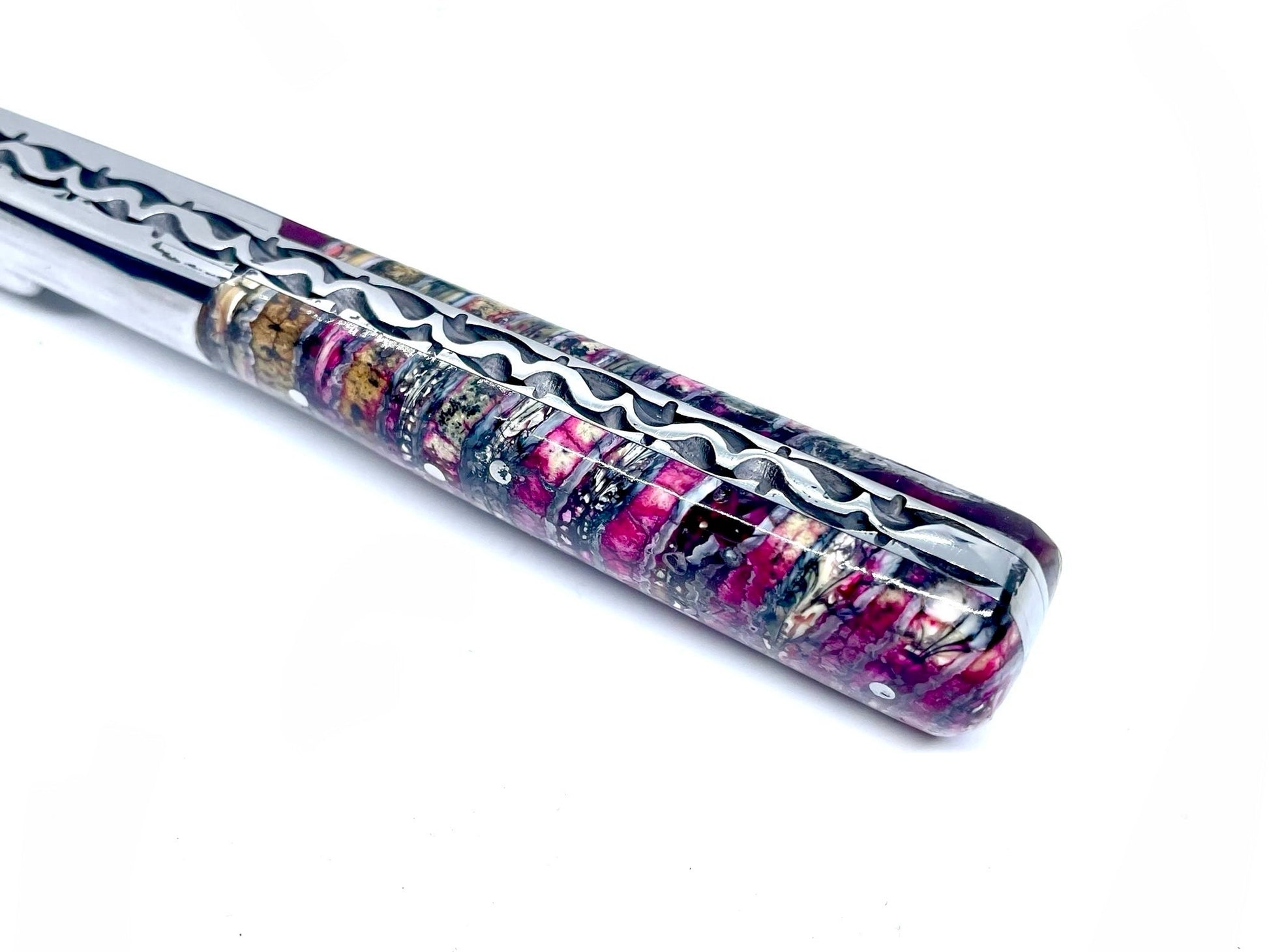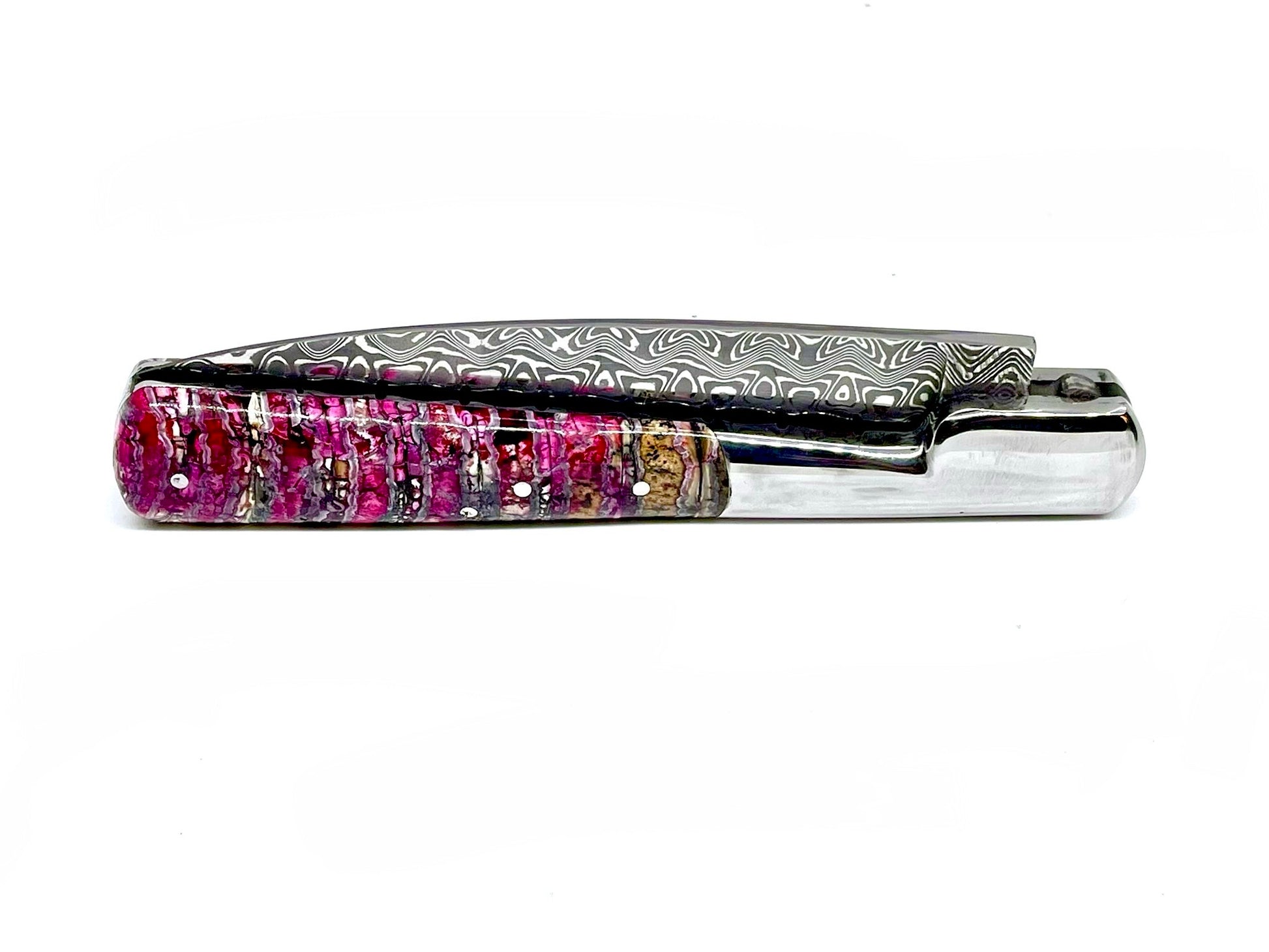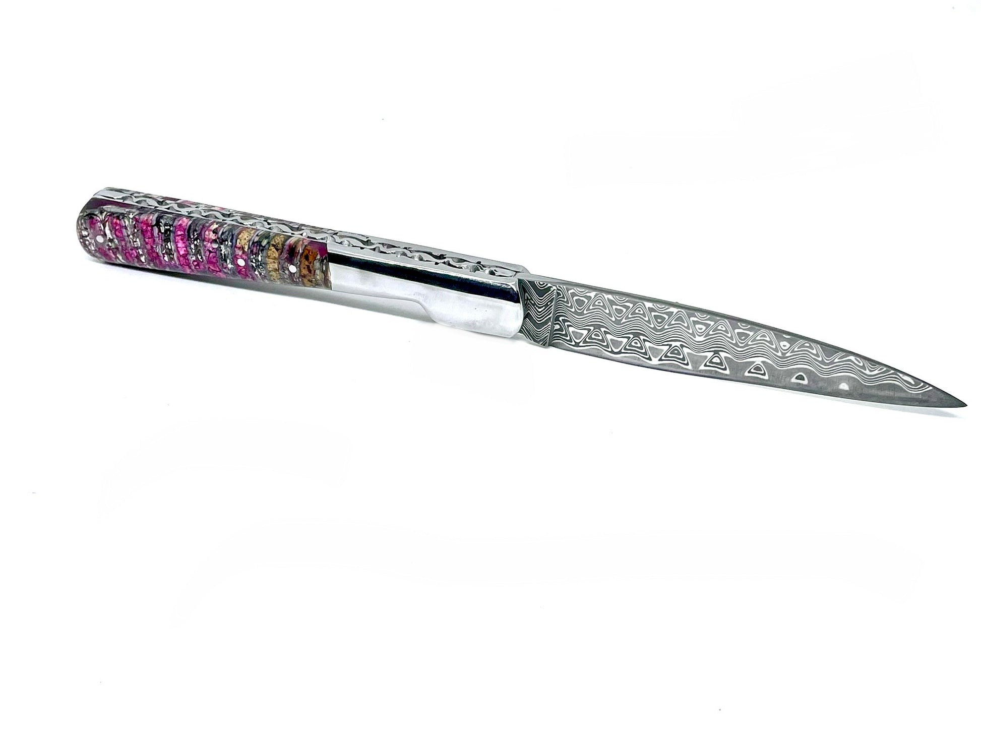 Lame de Damas inox torsadée de 160 couches, très haute qualité provenance des Forges de Thiers, capitale mondiale de la coutellerie.