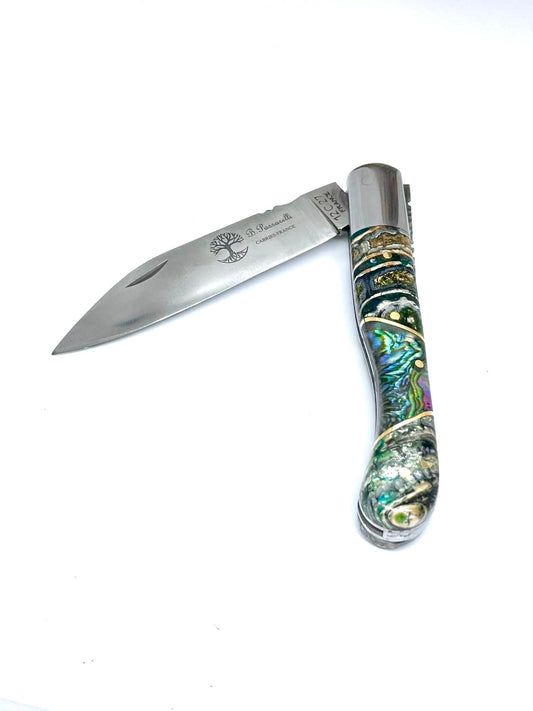 Coutellerie Passarelli - Couteau Aurillac lame pliable 10.5 cm molaire de mammouth teintée et stabilisée abalone