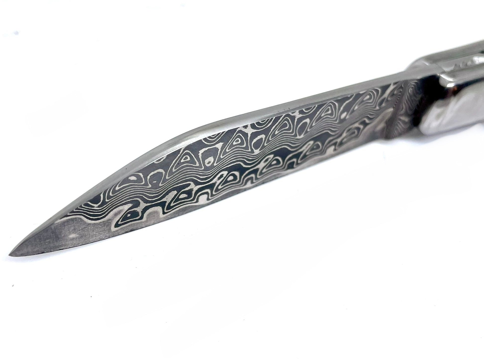 Lame de Damas inox torsadée de 160 couches, très haute qualité provenance des Forges de Thiers, capitale mondiale de la coutellerie.
