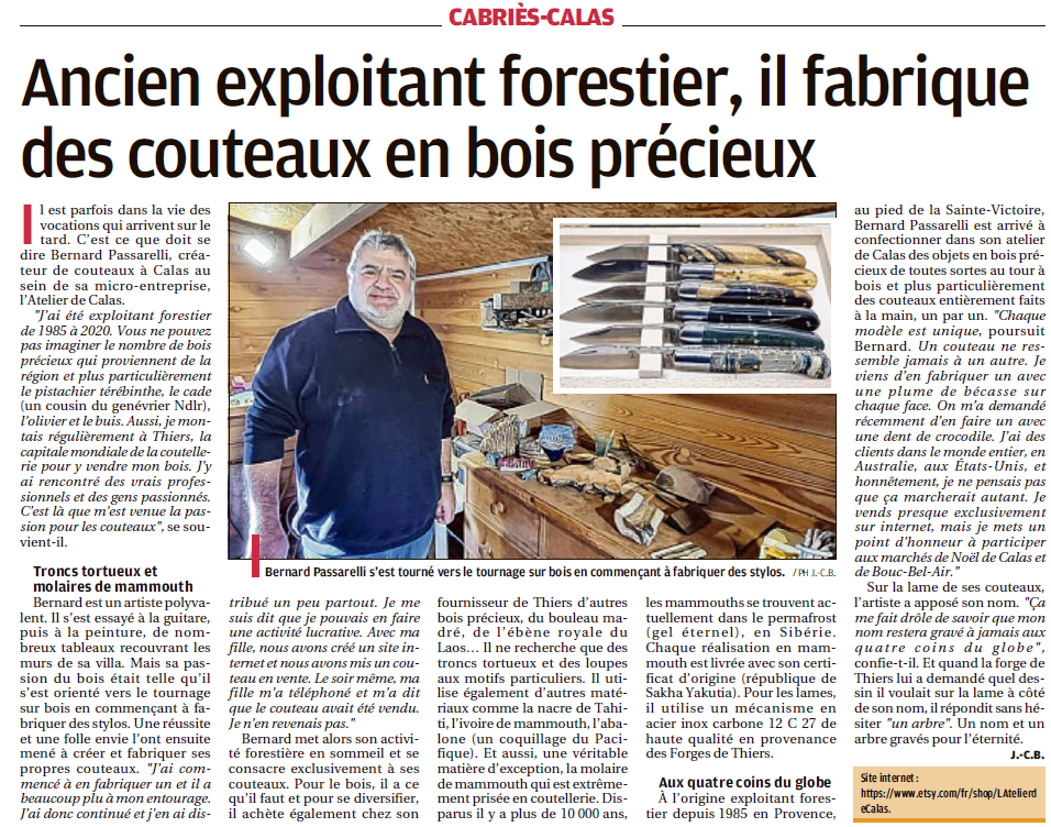 Fort de mon amour de toujours pour la nature et l'artisanat, je crée désormais dans mon atelier en Provence des couteaux en bois précieux et matières nobles.