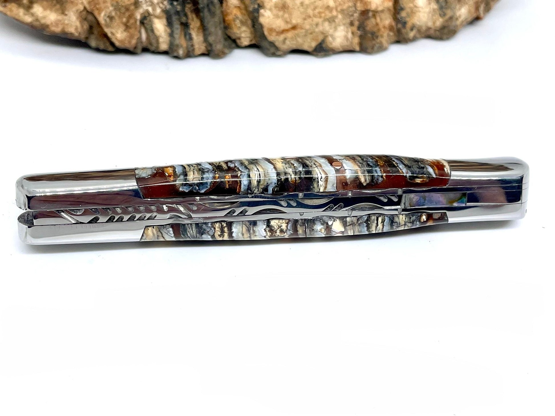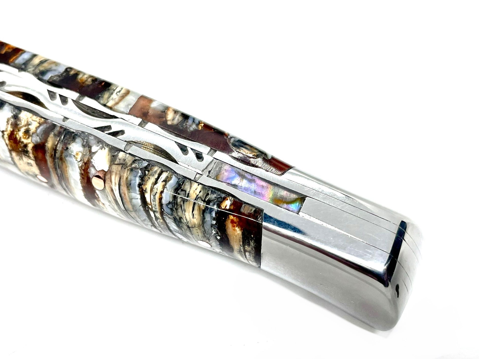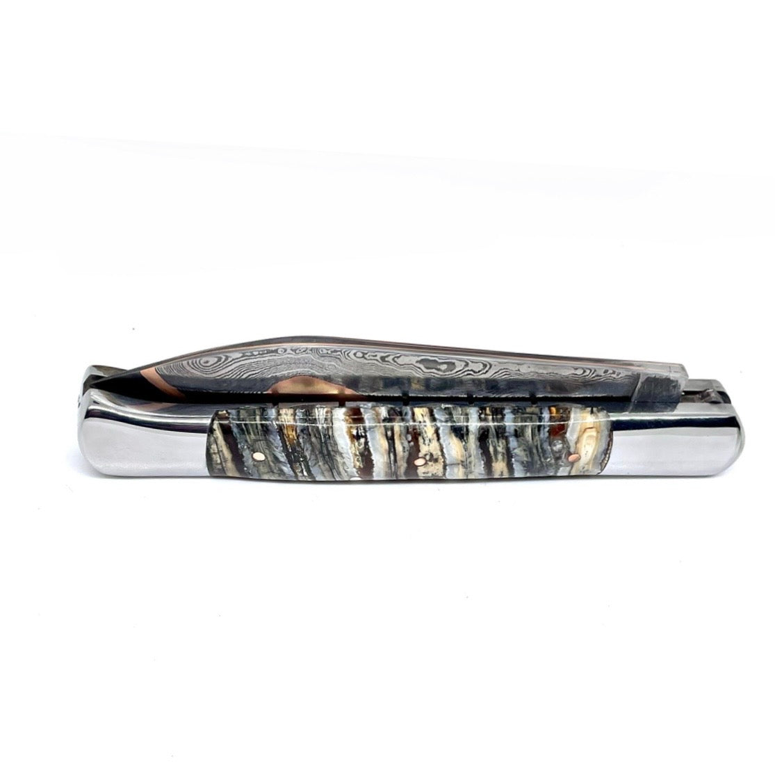 Véritable matière d’exception, la molaire de mammouth est extrêmement prisée en coutellerie. Disparus il y a plus de 10 000 ans, les mammouths se trouvent actuellement dans le permafrost (gel éternel), en Sibérie. Avec le réchauffement climatique, ces terres hostiles laissent apparaitre, en surface, des restes de Mammouths en parfait état de conservation.