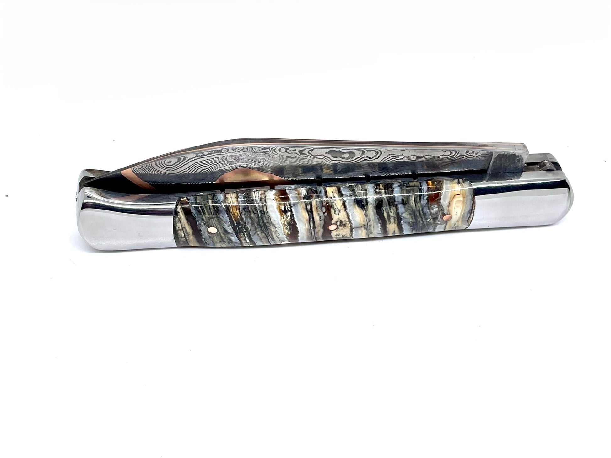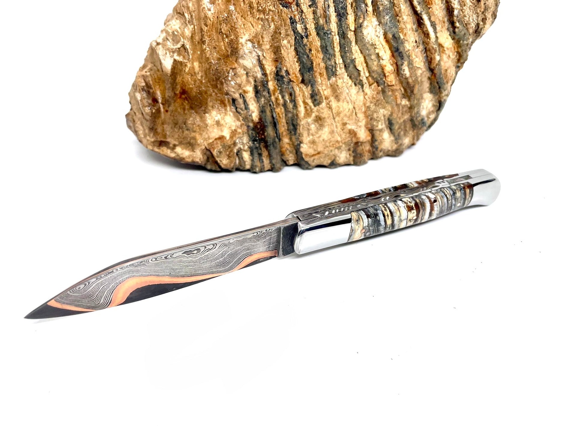 Couteau pliant damas artisanal - Roquefort en Molaire de Mammouth stabilisée et teintée lame de Damas pliable 11.5 cm GoMai-Sunset