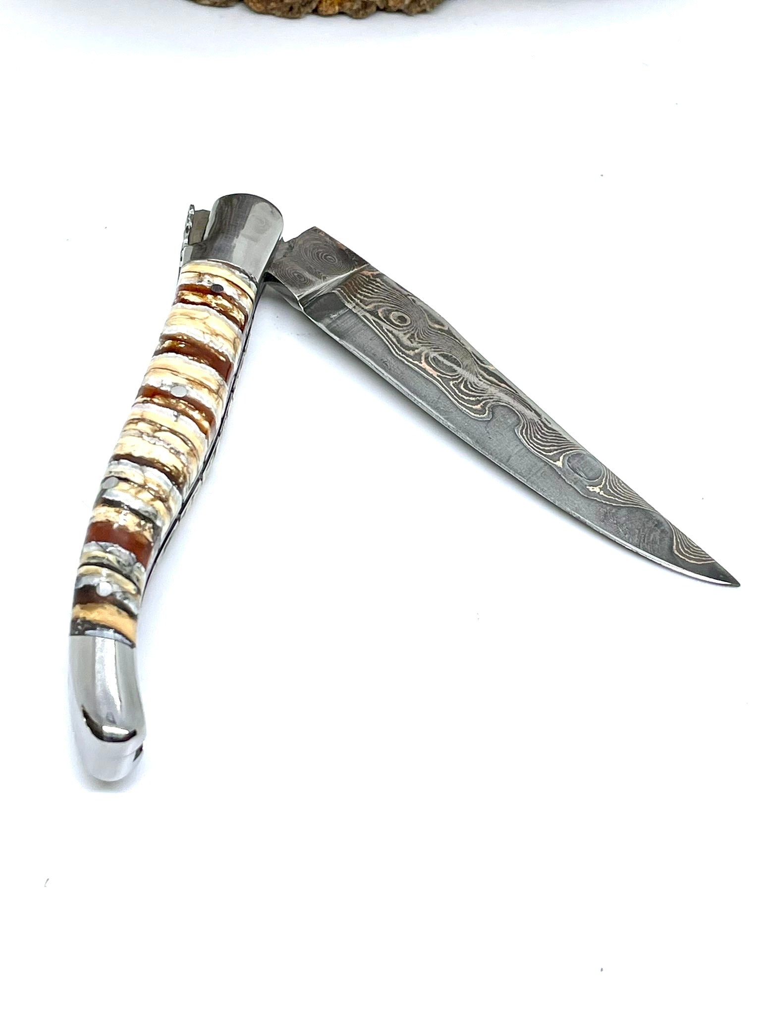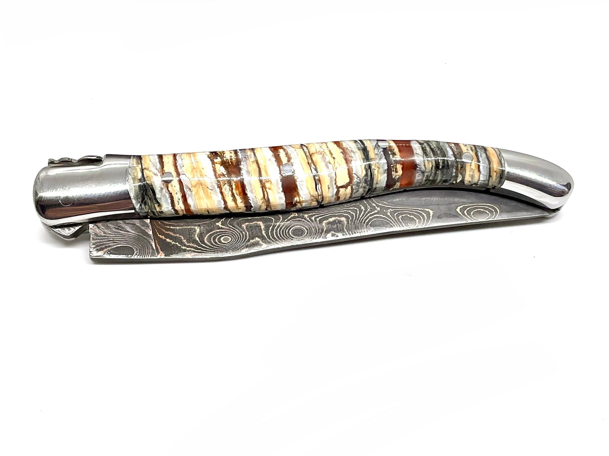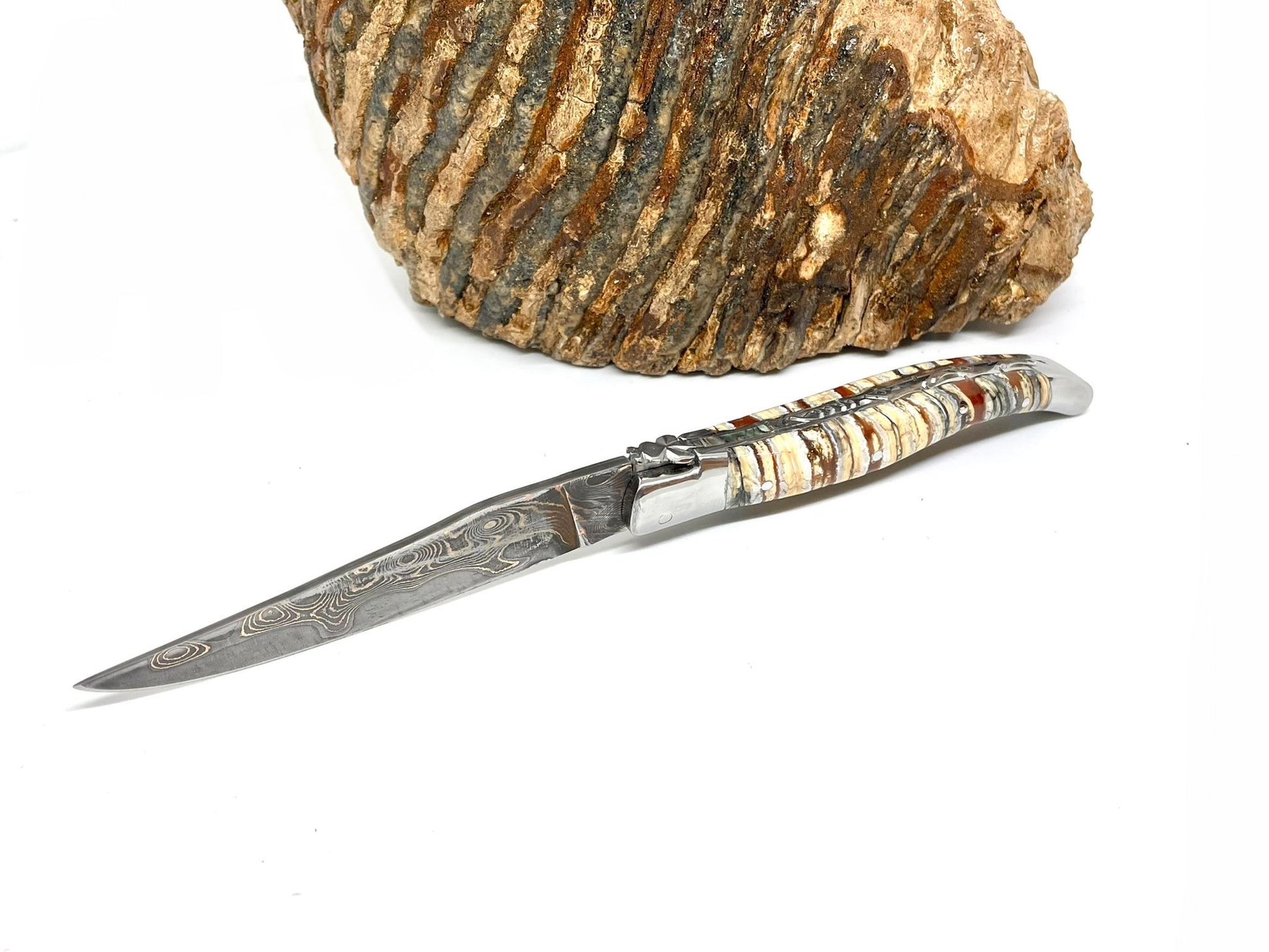 Couteau pliant damas artisanal - Laguiole Molaire de Mammouth stabilisée lame de Damas pliable 12 cm Lame Baker Forge - CopperMai Nishim - Ripple