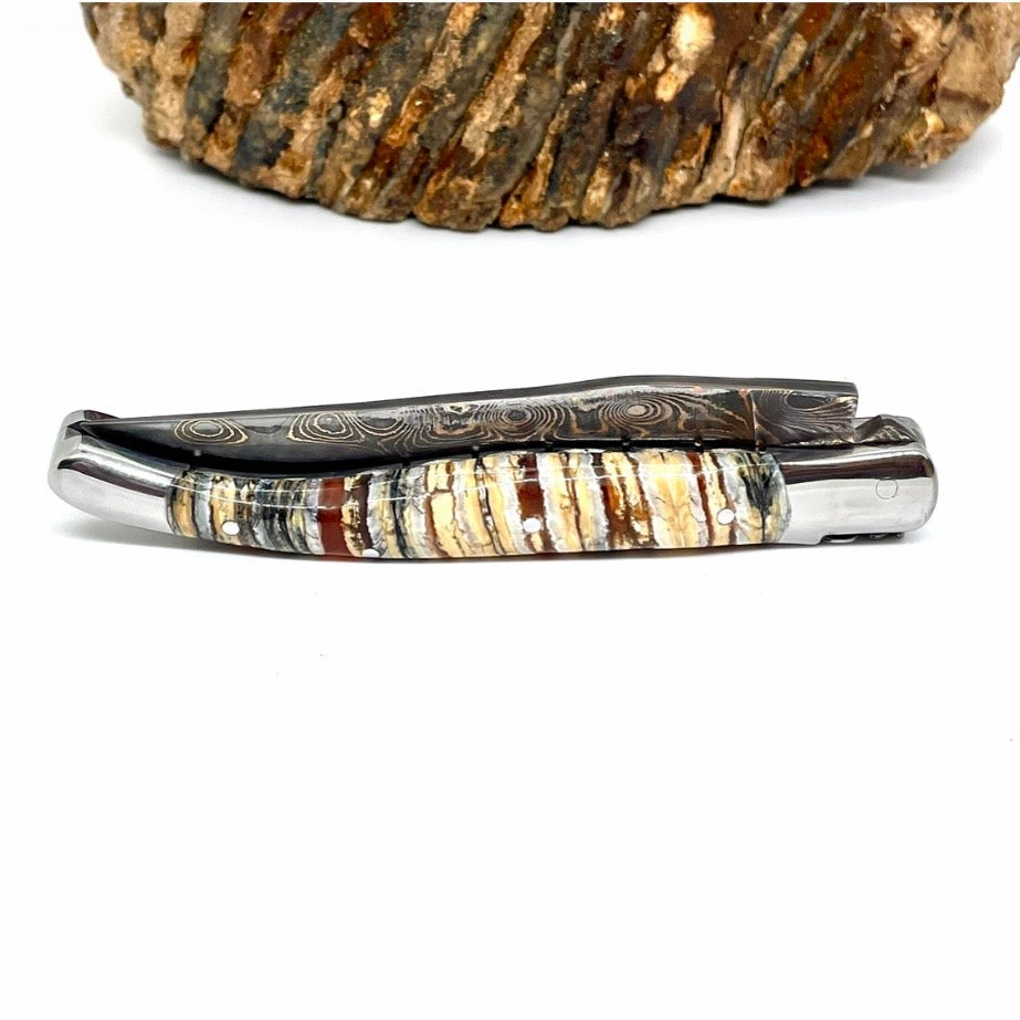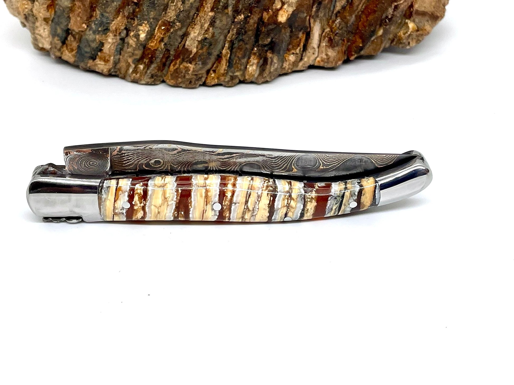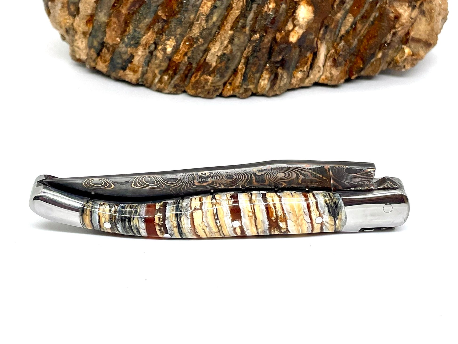 Couteau pliant damas artisanal - Laguiole Molaire de Mammouth stabilisée lame de Damas pliable 12 cm Lame Baker Forge - CopperMai Nishim - Ripple
