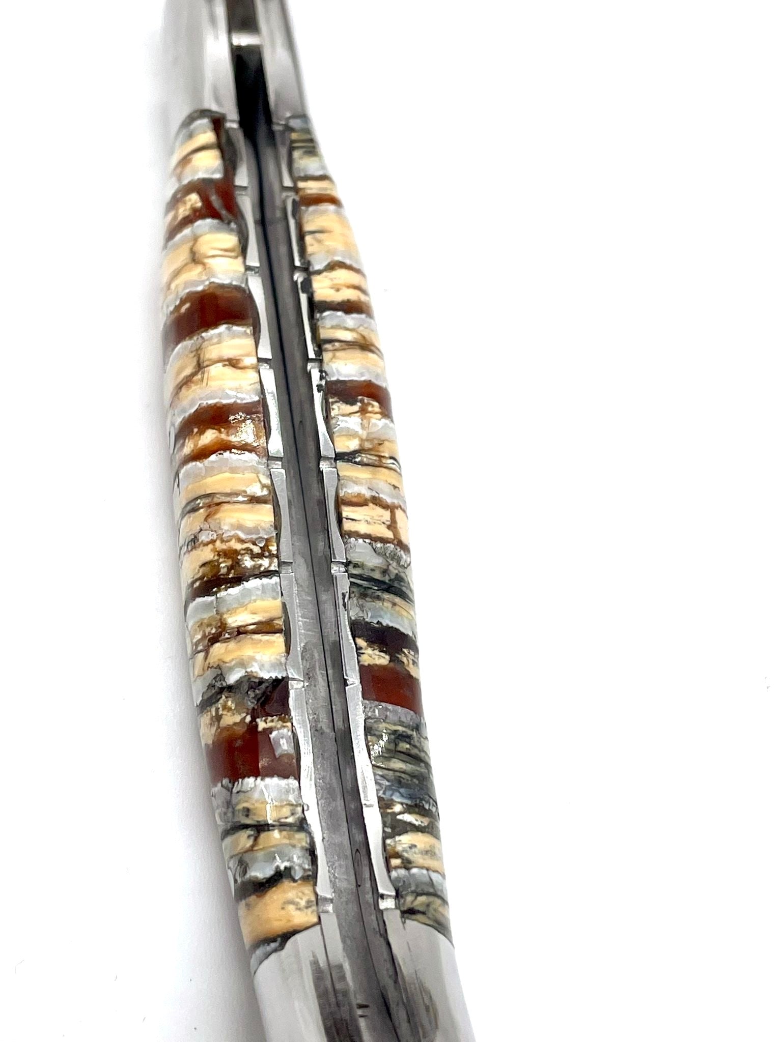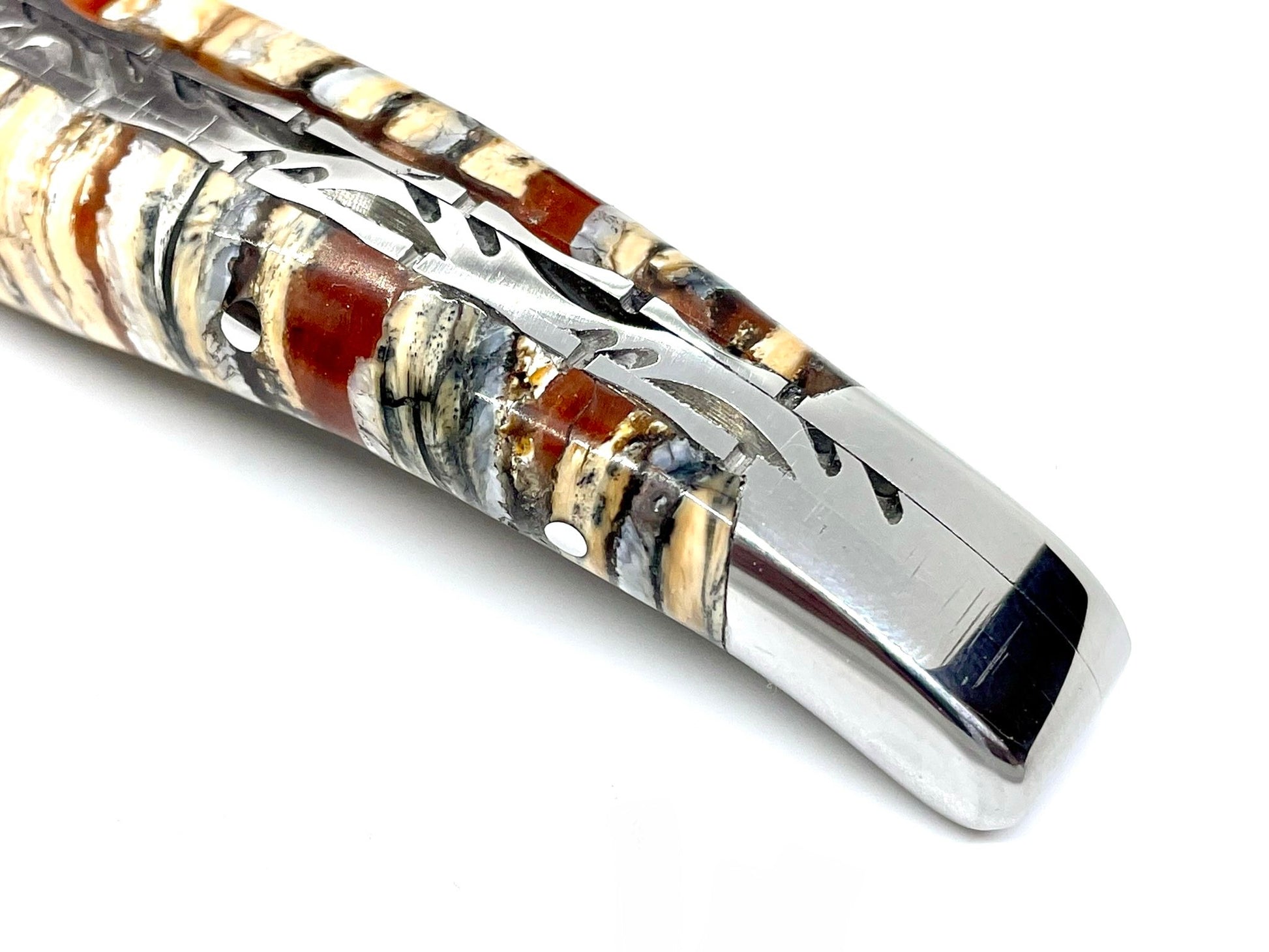 Véritable matière d’exception, la molaire de mammouth est extrêmement prisée en coutellerie. Disparus il y a plus de 10 000... Voir plus