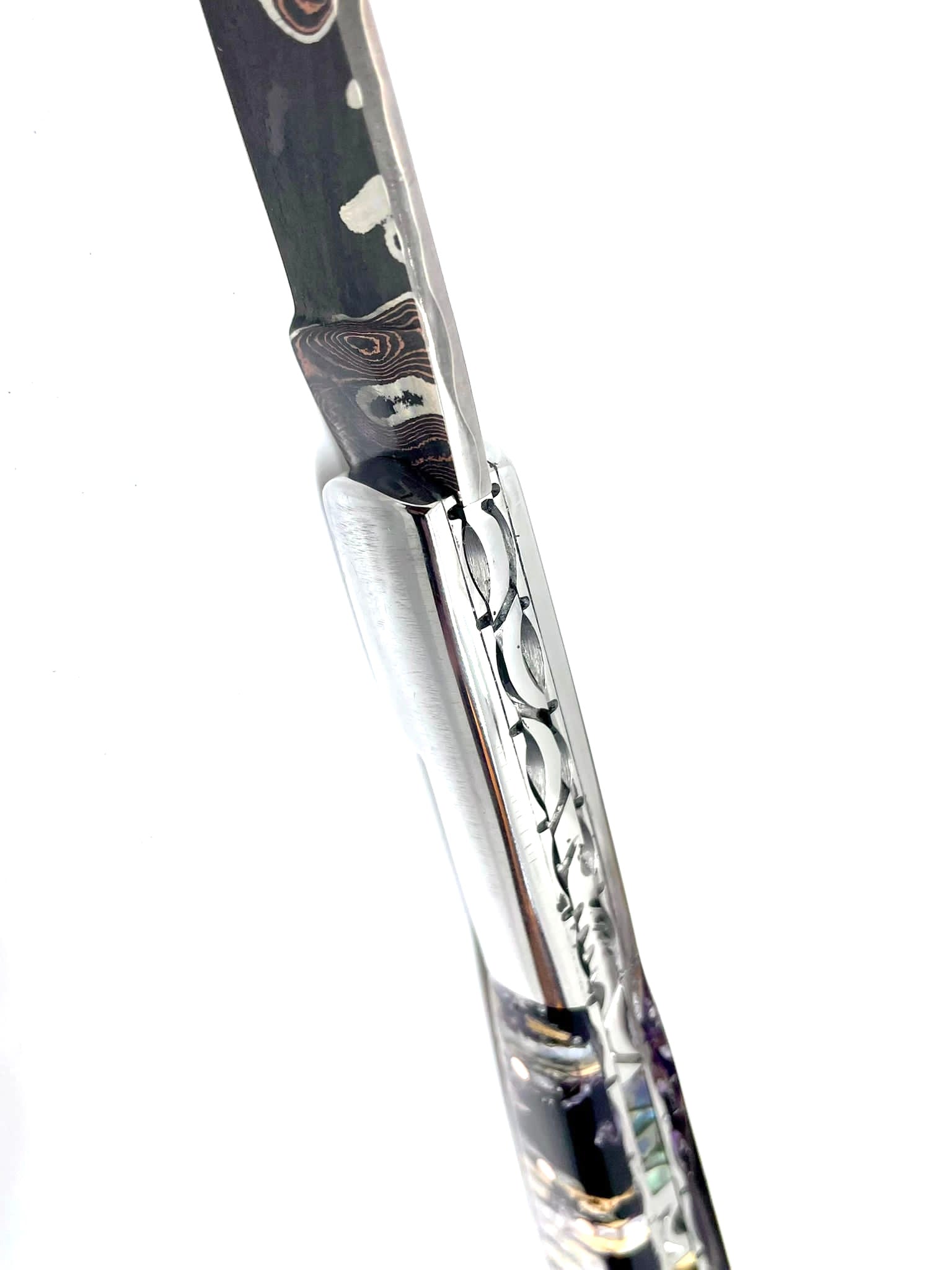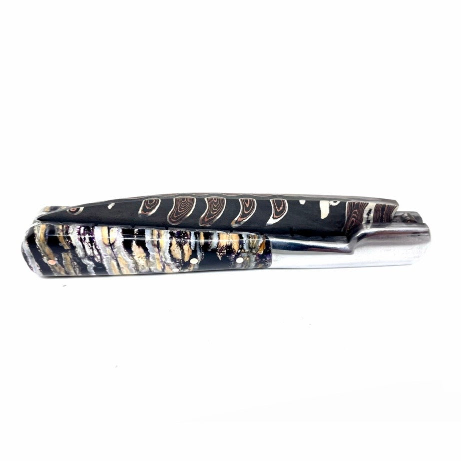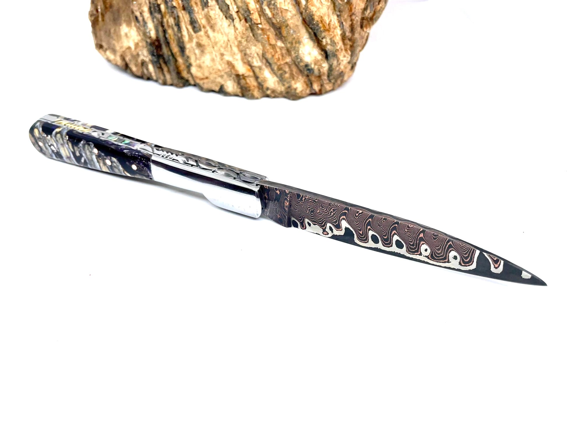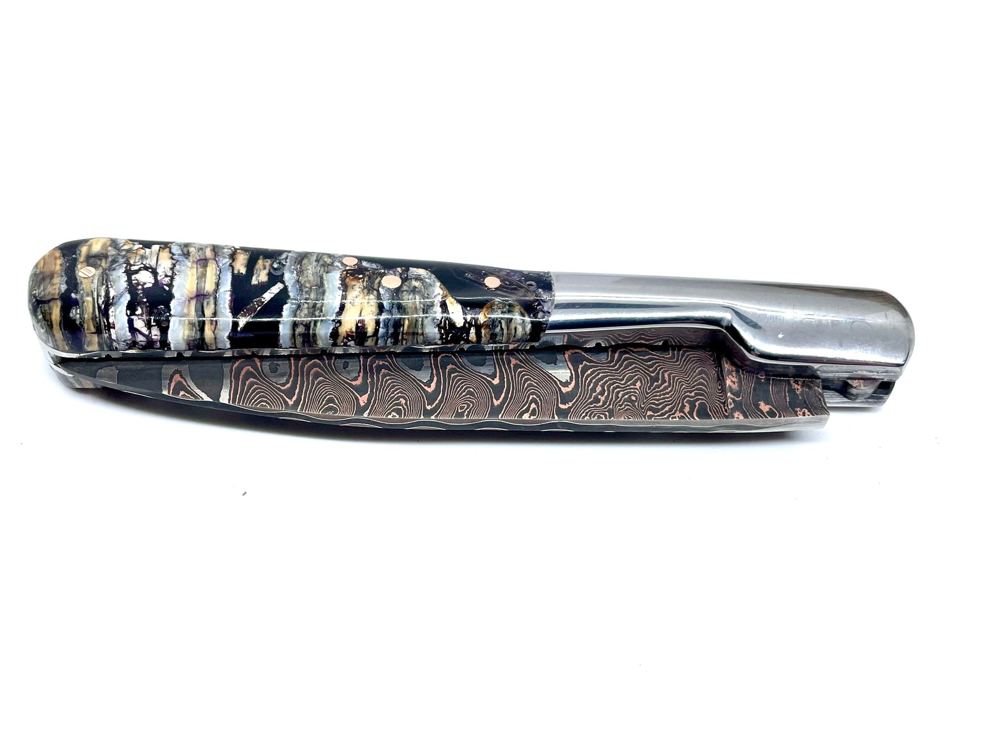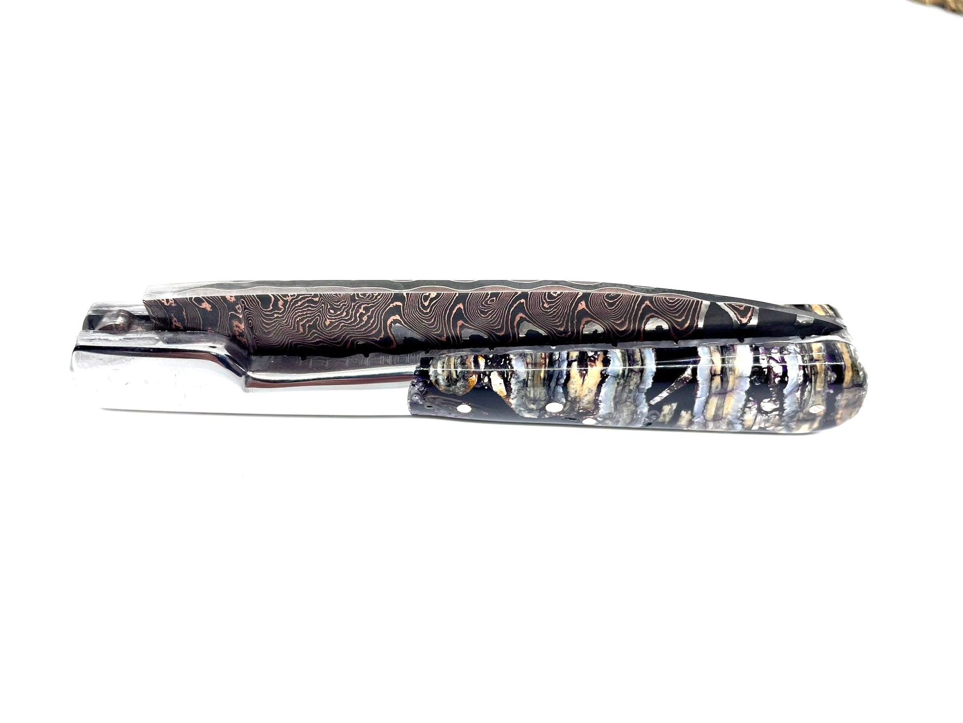 Couteau pliant damas artisanal - Vendetta Molaire de Mammouth stabilisée lame de Damas pliable 13 cm Lame Baker Forge - CopperMai Nishim - Ripple