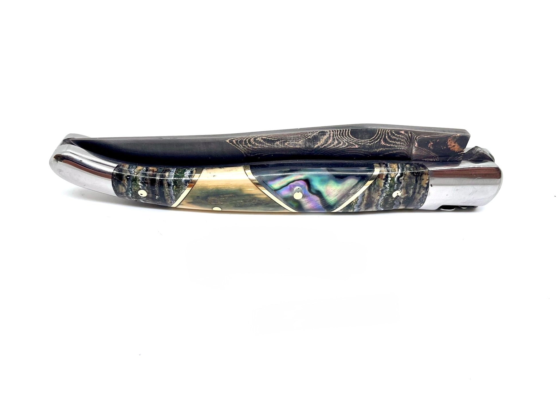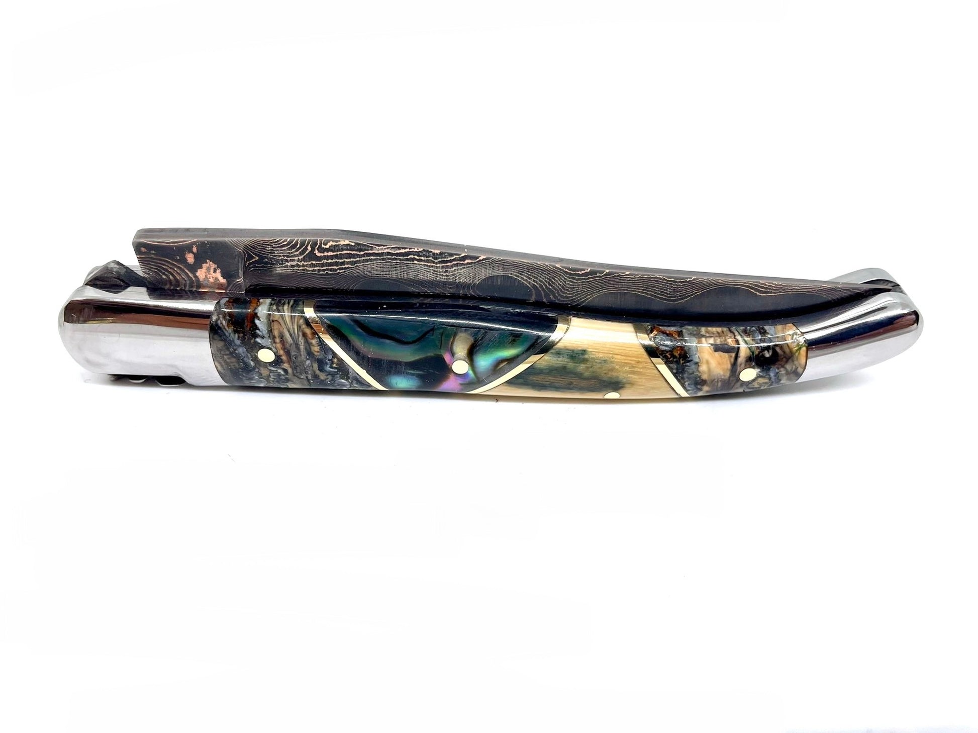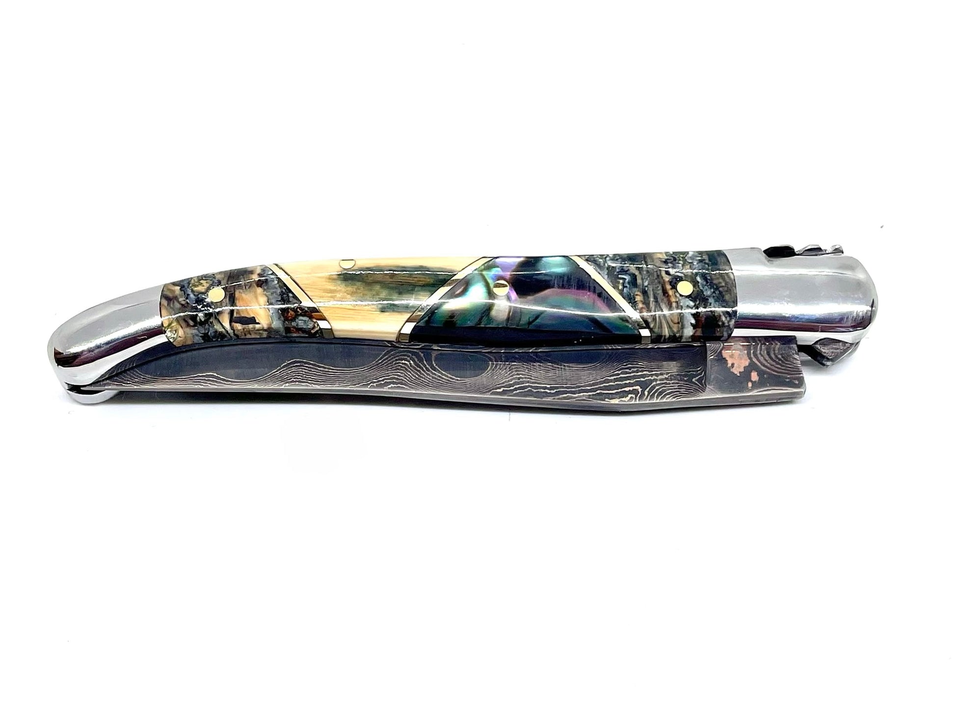 Couteau pliant damas artisanal - Laguiole Molaire de Mammouth teintée et stabilisée, défense bleue de mammouth et abalone, lame de Damas pliable 12 cm TigerMai-Raindrop