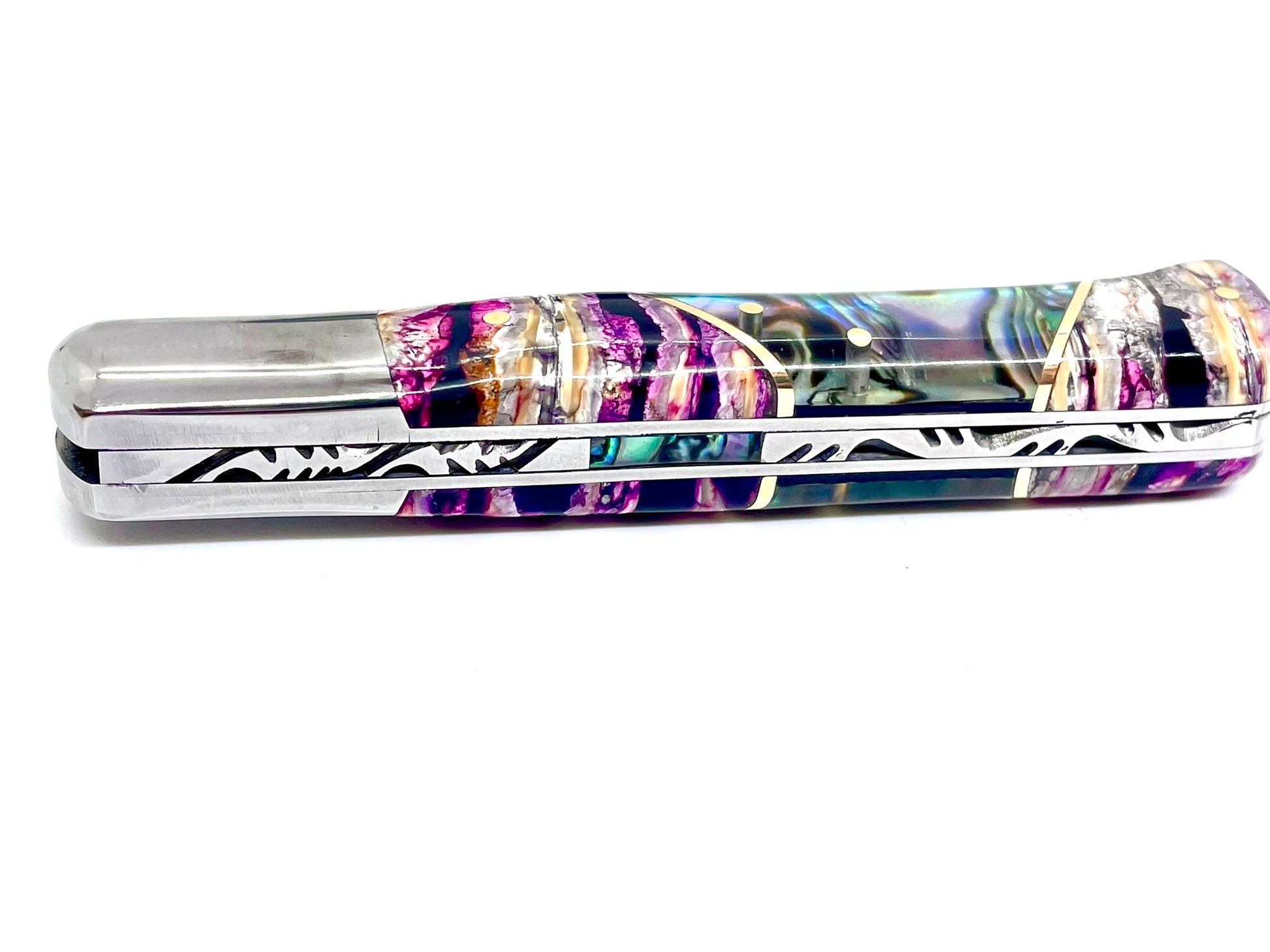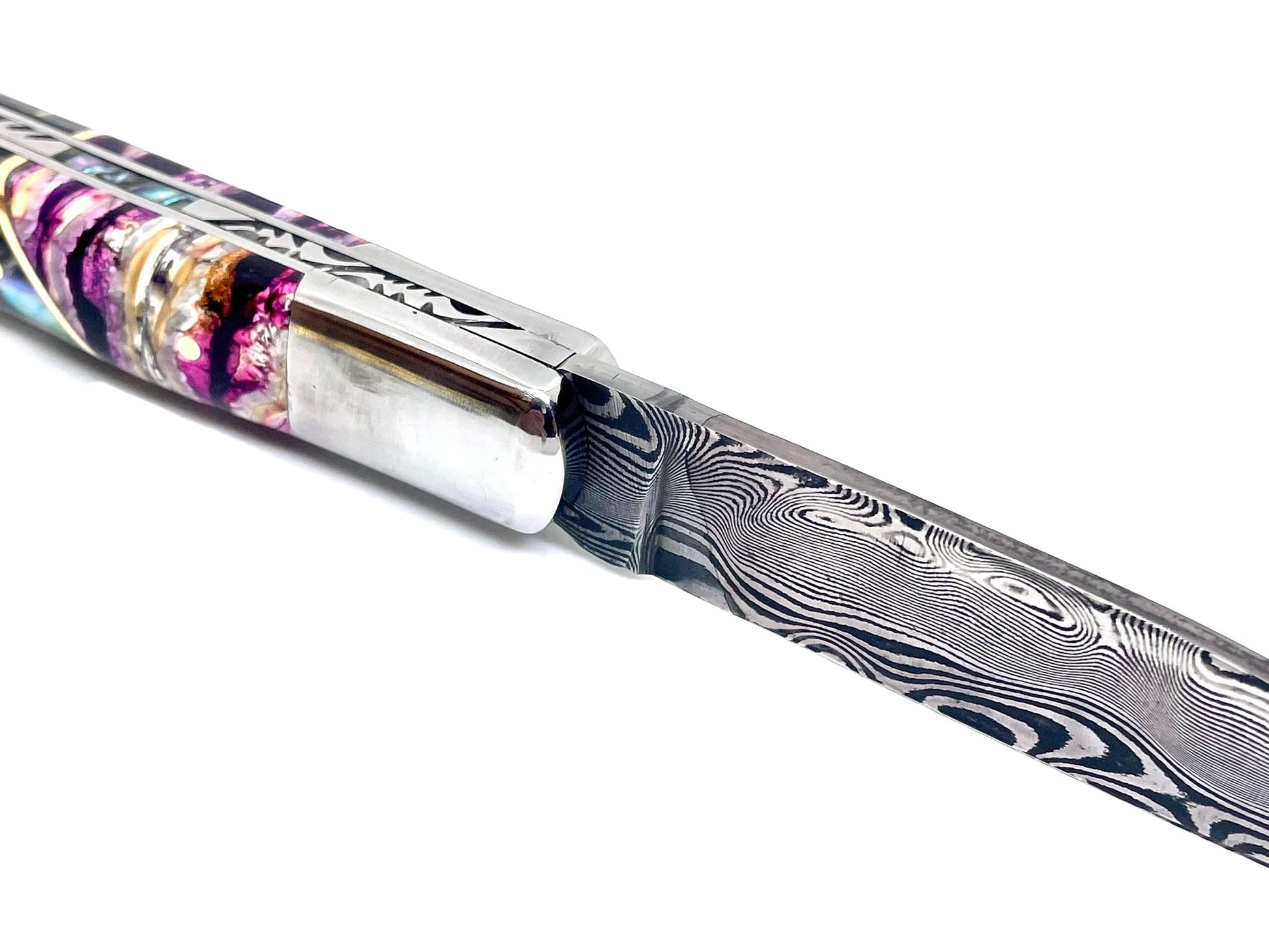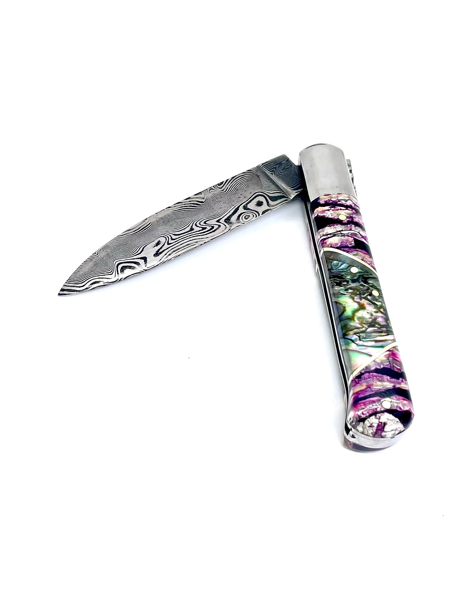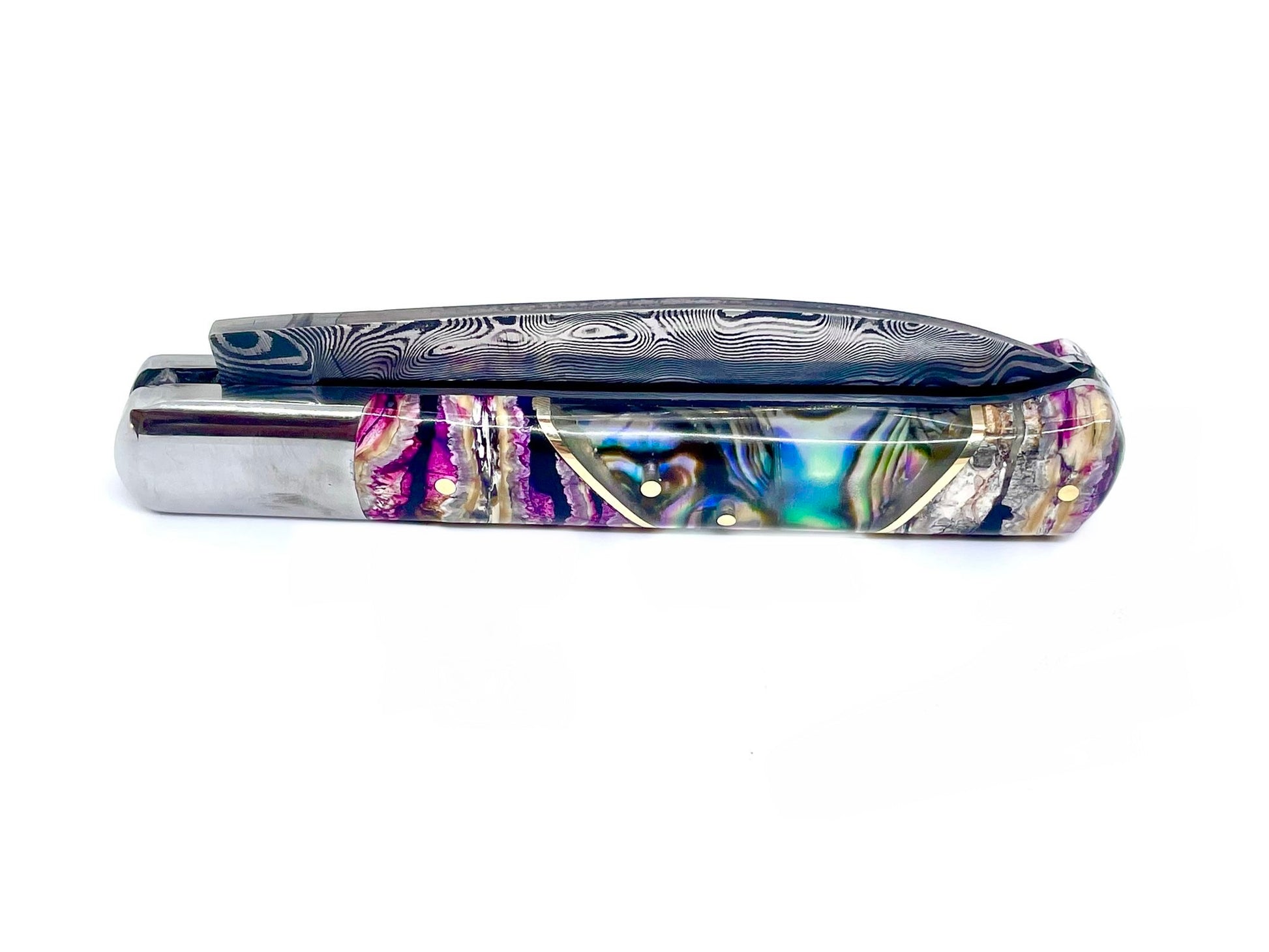 Coutellerie Passarelli - Couteau Yssingeaux lame de Damas 10,5 cm molaire de mammouth stabilisée et teintée et abalone